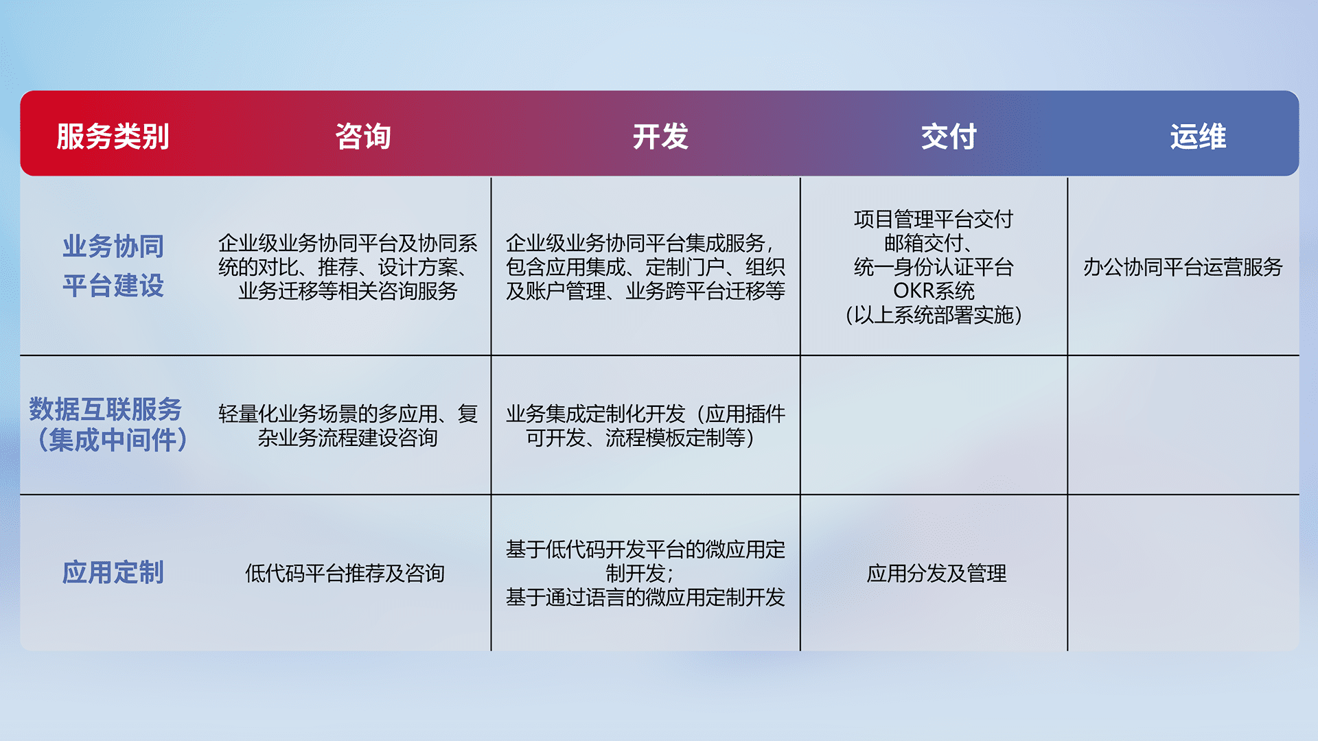 针对钉钉、、、、企微、、、IDaas等平台级产品提供产品的规划、、、、方案、、、交付、、定制化开发等服务,,实现如统一协同办公、、智能客户服务、、、、混合会议管理、、、智能数据查询、、、等业务场景,,实现数字化转型。。。
