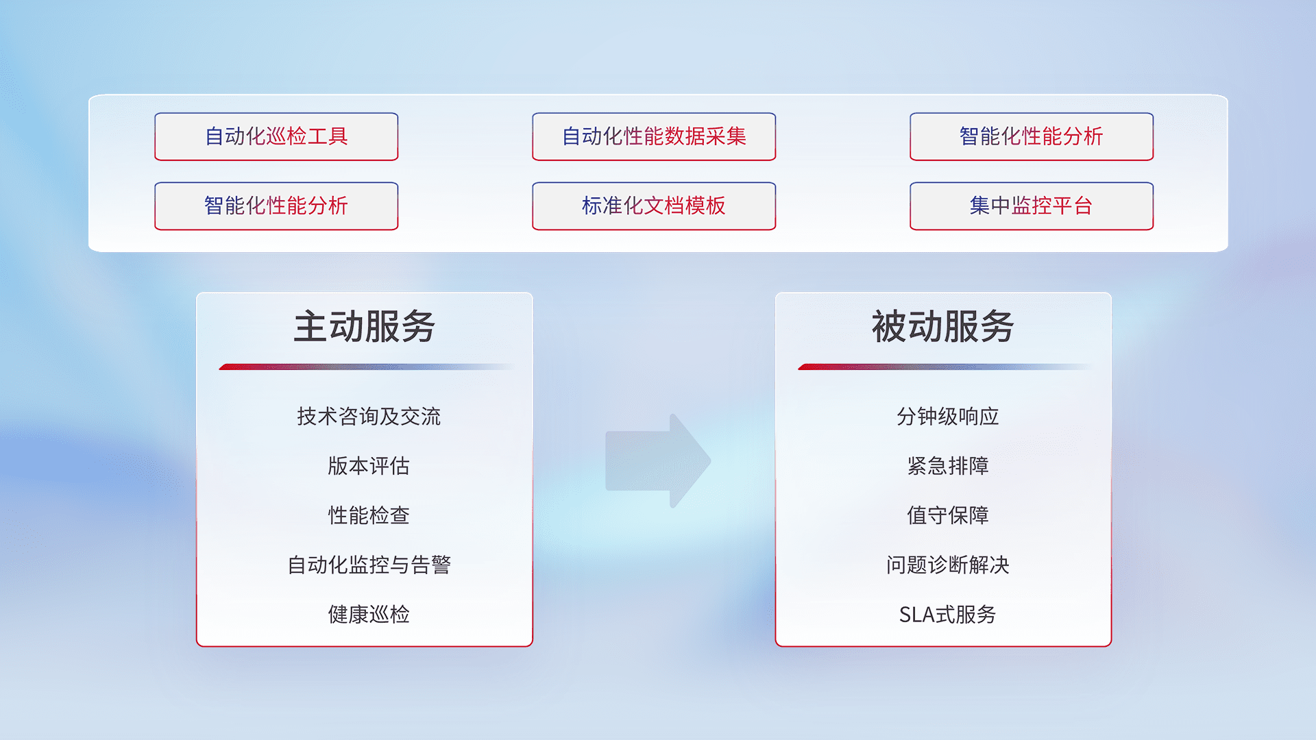 智能化工具和标准化文档,,,,保障服务质量,,,提供主动服务(包含技术咨询、、、版本评估、、性能检查、、、、自动化监控与告警、、、健康巡检)和被动服务包含(分钟级响应、、紧急排障、、、值守保障、、、问题诊断解决、、SLA服务)。。。。